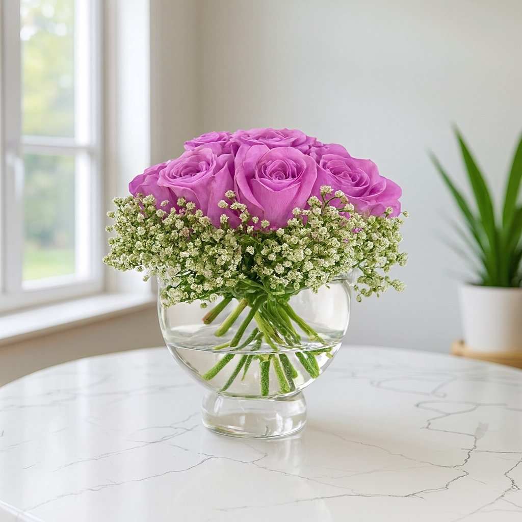 • Glass Vase: placed in a round clear glass vase with water and stems visible.