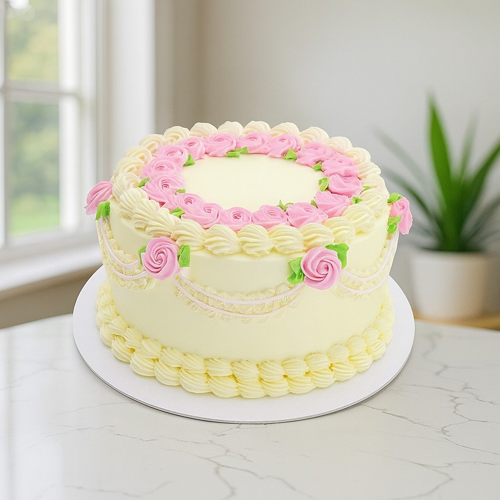 Decoration: smooth buttercream icing base, Single large pink flower with green petals, Additional buttercream blooms for detailing, Double-line design in the center with floral touches, Decorative buttercream piping at the bottom