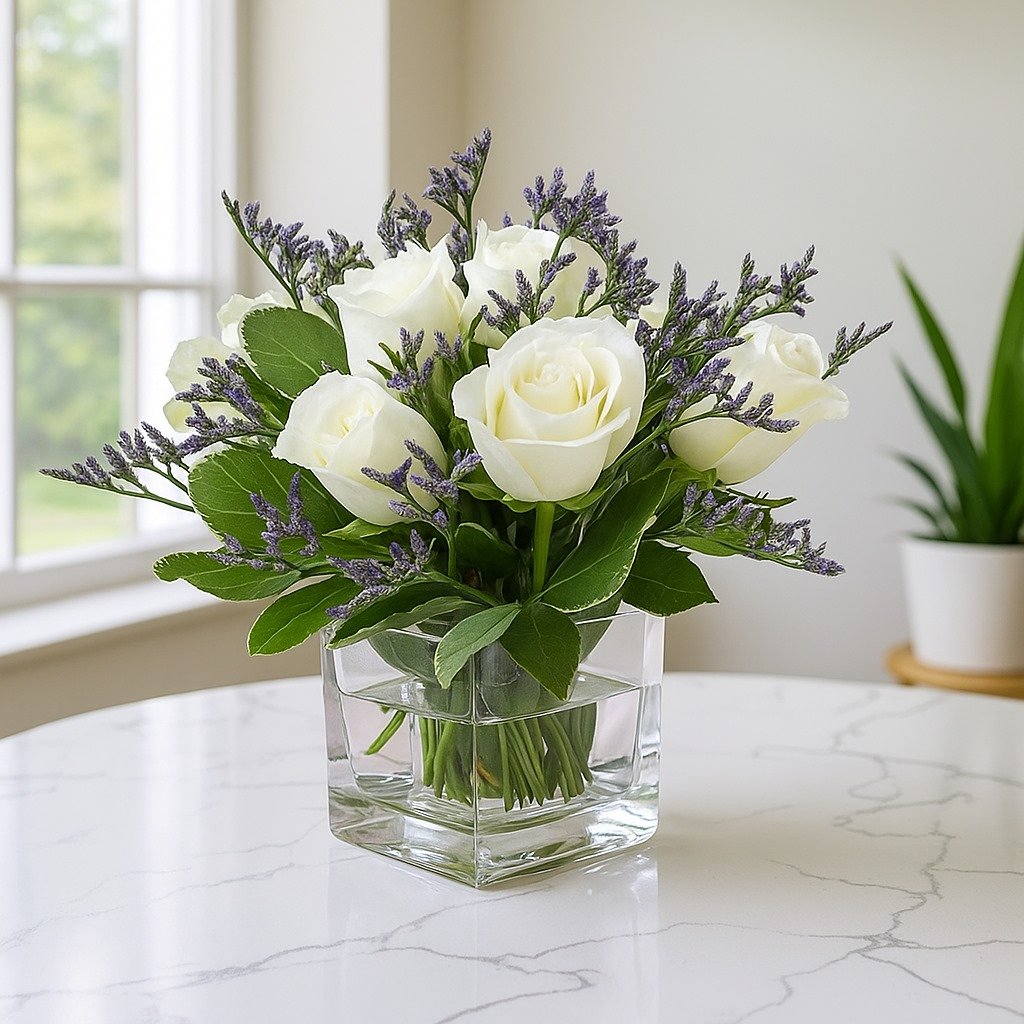 A classic combination of fresh green eucalyptus leaves, fragrant lavender sprigs, and pure white roses, exquisitely arranged in a clear square glass vase with water for long-lasting freshness. This arrangement is perfect for gifting or bringing calm to your own space because it strikes the ideal balance between elegance and tranquility.