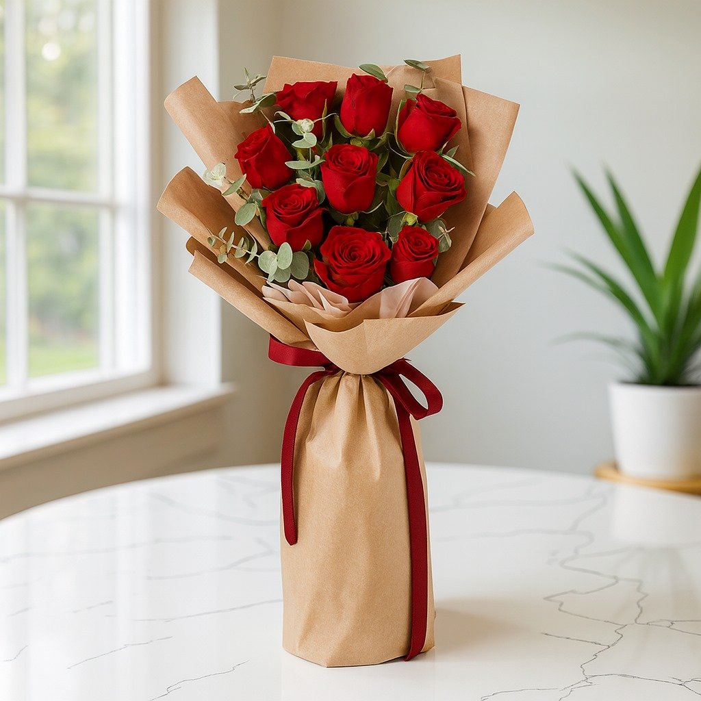 Beautifully wrapped in rustic light brown craft paper, this stunning bouquet of fresh red roses is adorned with flat green leaves and finished with a striking red ribbon bow. This bouquet is the ideal representation of passion, love, and classic romance.